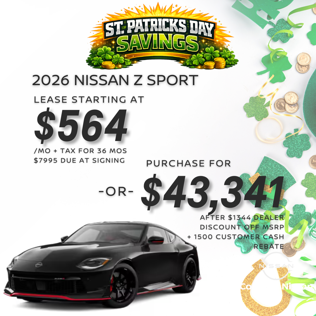 2026 NISSAN Z SPORT M/T VIN:JN1BZ4AH6TM500514, MSRP OF $46,185. Lease based on $7,995 due at lease inception, $7,995 CUSTOMER OUT OF POCKET which includes first month payment. Selling price $44,841. $695 acquisition fee. No security deposit required. Option to purchase at lease end $28,172.85. Lessee is responsible for $0.25 per mile over 10,000 miles/year, excess ear and $395 Disposition fee. All offers: Prices do not include government fees and taxes, any finance charges, $85 dealer document processing fee, $37 electronic filing fee and any emissions testing fee. Only 1 at this offer VIN: Only 1 at this offer VIN: JN1BZ4AH6TM500514. See dealer for details. All offers expire 04/03/2026.2026 NISSAN Z SPORT M/T VIN:JN1BZ4AH6TM500514, MSRP OF $46,185. $43,341 after $1,344 dealer discount off MSRP and $1,500 Customer Cash Rebate. $1,500 Customer Cash Rebate not available with NMAC Special APR offer or leasing offer. All offers: Prices do not include government fees and taxes, any finance charges, $85 dealer document processing fee, $37 electronic filing fee and any emissions testing fee. Only 1 at this offer VIN: Only 1 at this offer VIN: JN1BZ4AH6TM500514. See dealer for details. All offers expire 04/03/2026.