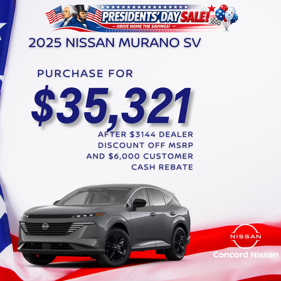 2025 NISSAN MURANO SV FWD: 5N1AZ3BJ6SC125003. MSRP of $44,465. $35,747 after $2,968 dealer discount off MSRP and $5,000 Customer Cash Rebate. This price offer not available with 0% APR with NMAC. All offers: Prices do not include government fees and taxes, any finance charges, $85 dealer document processing fee, $37 electronic filing fee and any emissions testing fee. Only 1 available at this price offer VIN: 5N1AZ3BJ6SC125003. See dealer for details. All offers expire 03/02/2026.