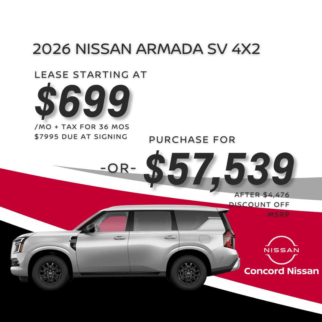 2026 NISSAN ARMADA SV 2WD: JN8AY3AD7T9320226. MSRP of $62,015. Lease based on $7,995 due at lease inception, $7,995 CUSTOMER OUT OF POCKET which includes first month payment. Selling price $57,539 after $4,476 dealer discount off MSRP. $695 acquisition fee. No security deposit required. Option to purchase at lease end $36,588.85. Lessee is responsible for $0.25 per mile over 10,000 miles/year, excess wear and $395 Disposition fee. All offers: Prices do not include government fees and taxes, any finance charges, $85 dealer document processing fee, $37 electronic filing fee and any emissions testing fee. Only 1 available at this offer VIN: JN8AY3AD7T9320226. See dealer for details. All offers expire 02/02/2026.2026 NISSAN ARMADA SV 2WD: JN8AY3AD7T9320226. MSRP: $62,015. $57,539 after $4,476 discount off MSRP. This price offer not available with NMAC Special APR. All offers: Prices do not include government fees and taxes, any finance charges, $85 dealer document processing fee, $37 electronic filing fee and any emissions testing fee. Only 1 available at this price offer VIN: JN8AY3AD7T9320226. See dealer for details. All offers expire 02/02/2026.